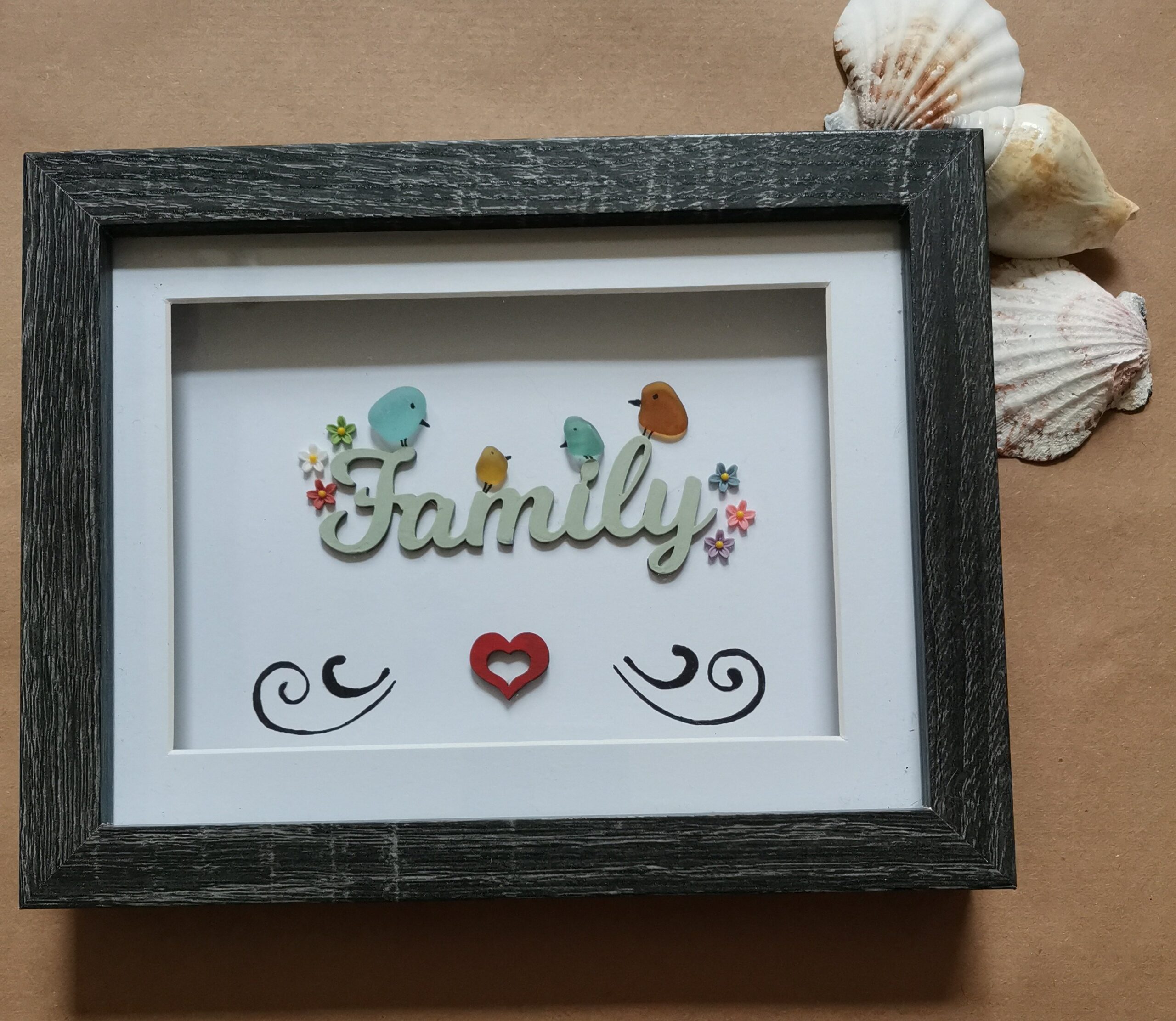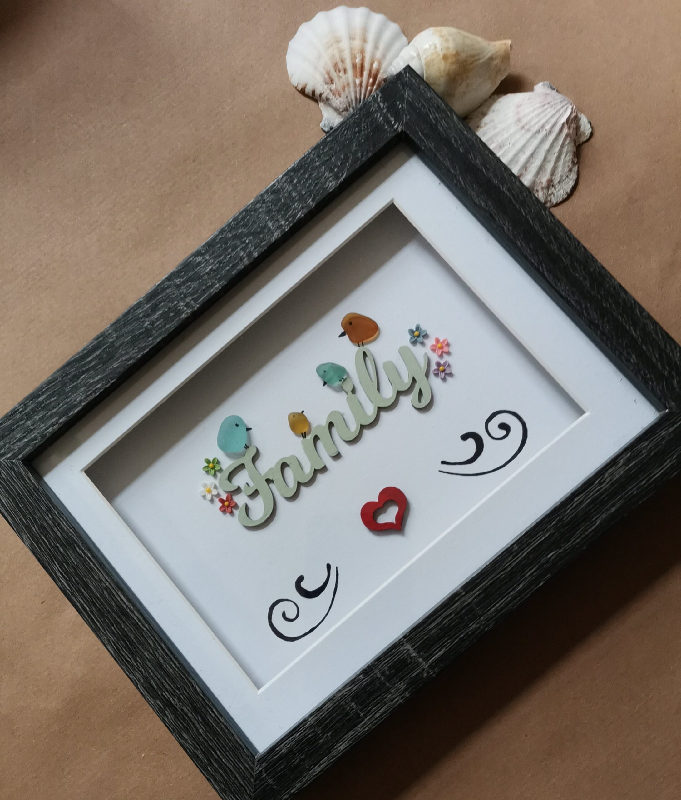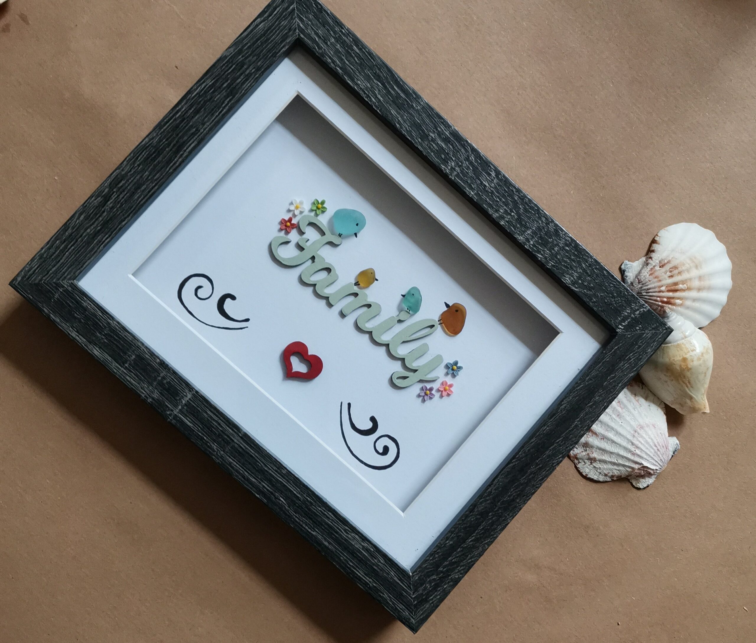 A beautiful family frame made with mdf wording/heart and sea glass birds