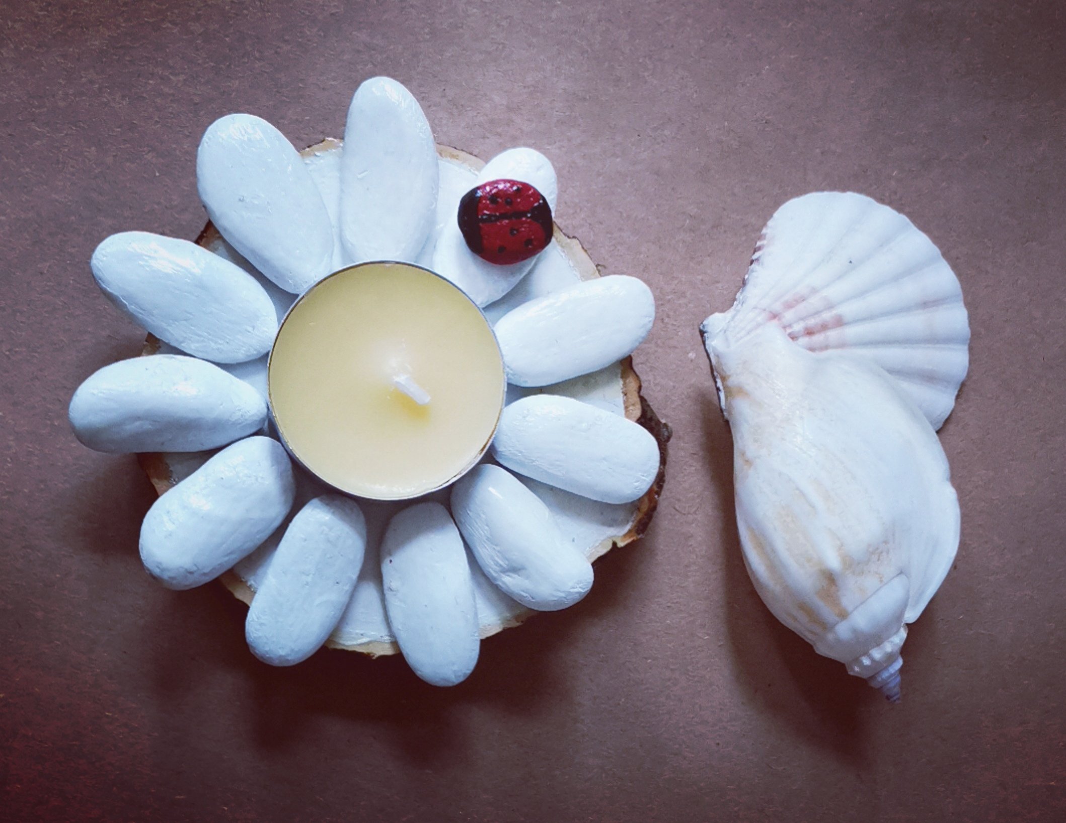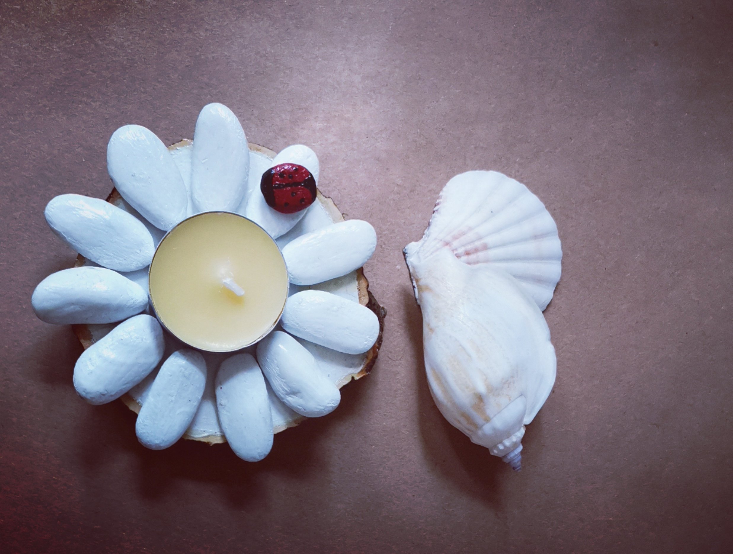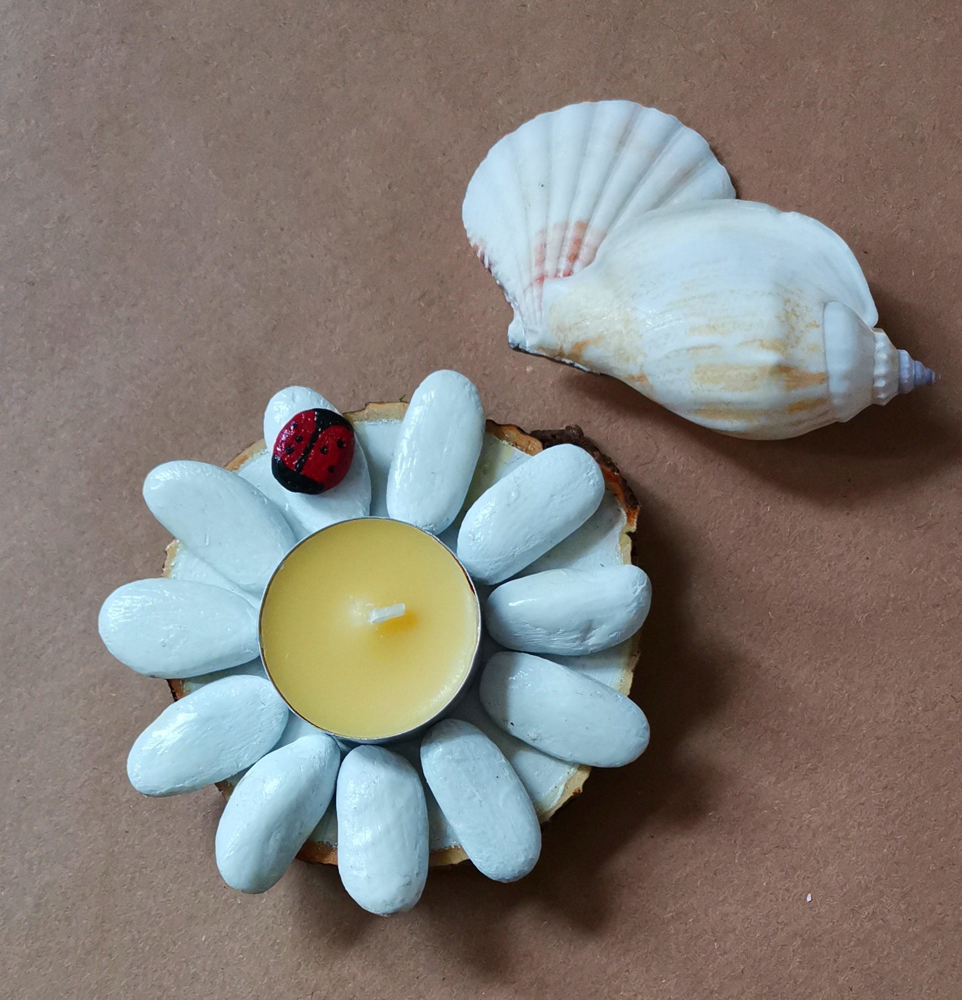 A 7-8 cm logslice, using pebbles made into a tea light holder