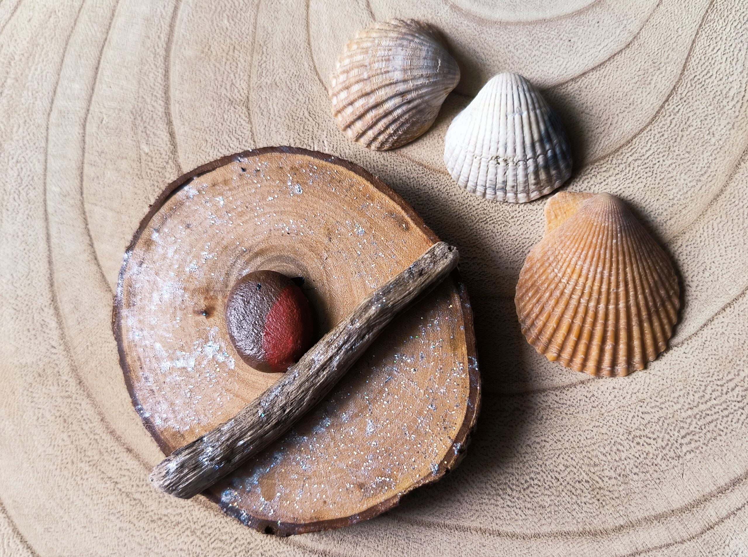 A glittery robin on a beautiful logslice.