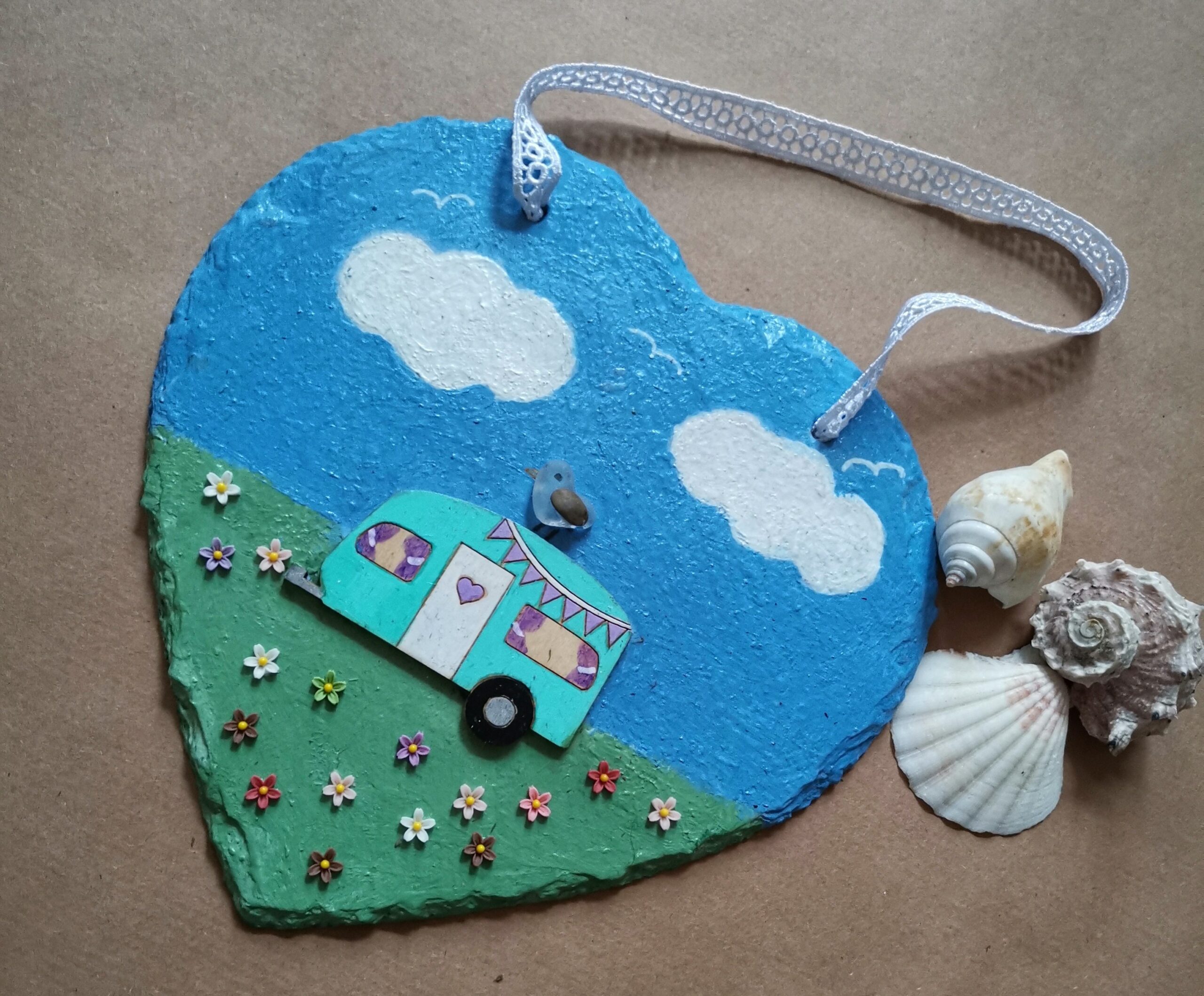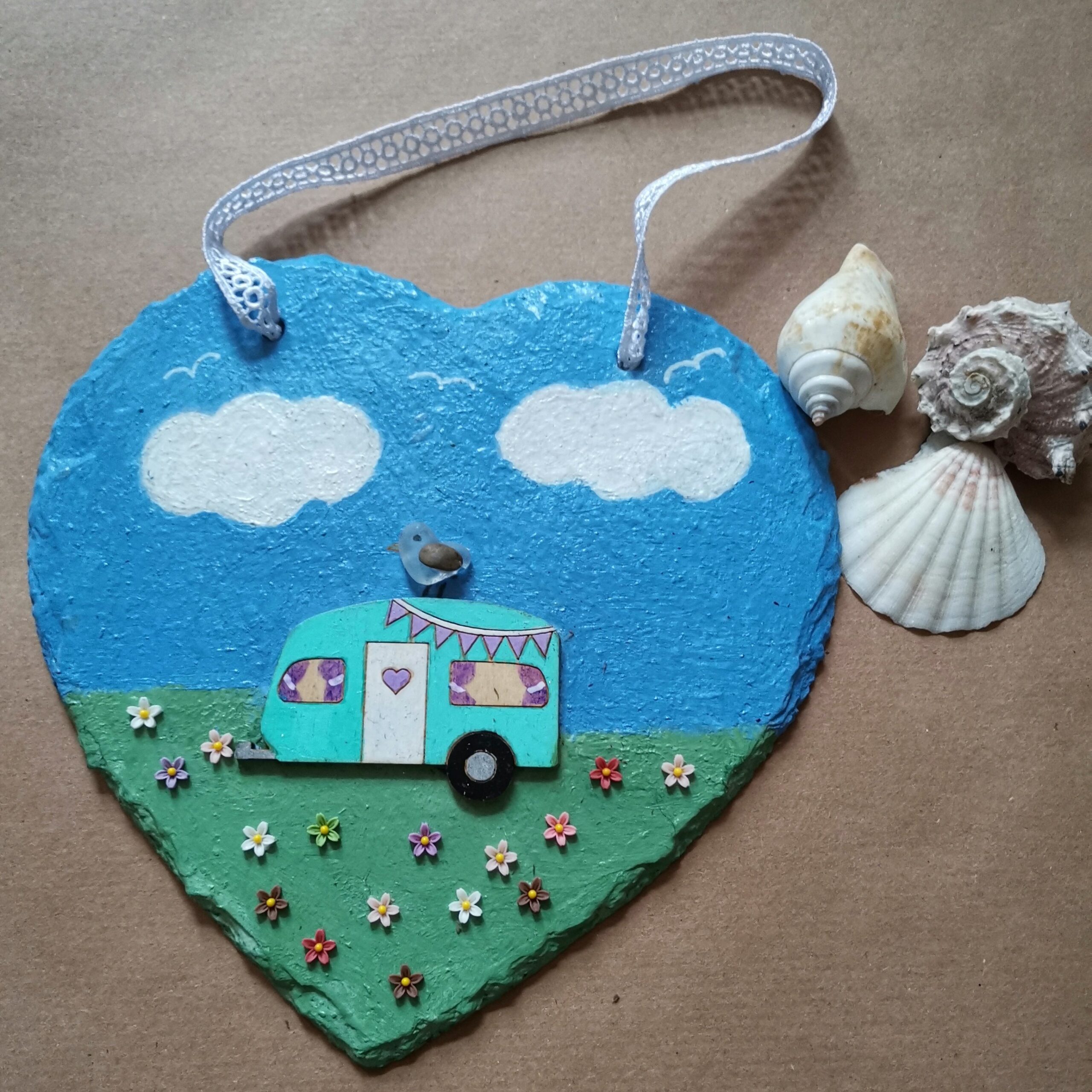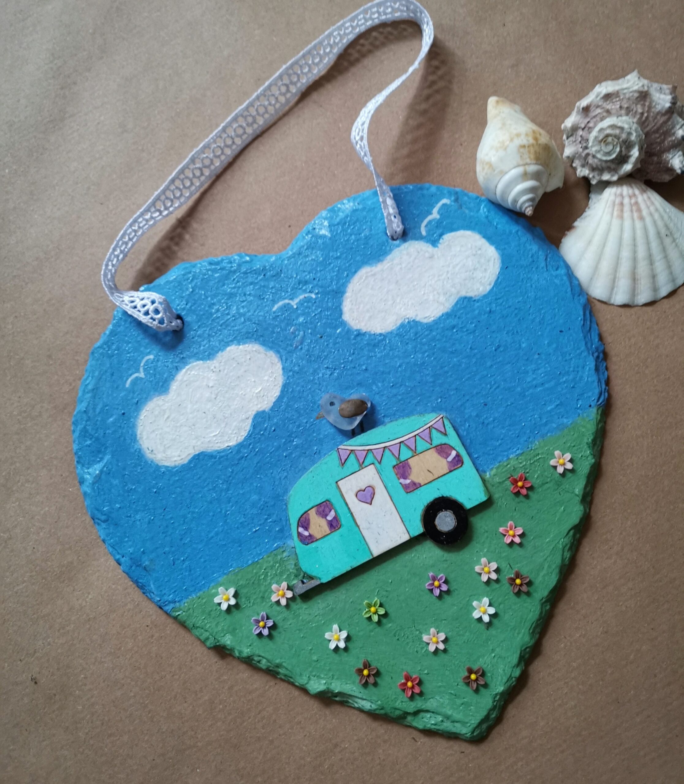 A slate heart painted many beautiful colours, caravaning adventure.
