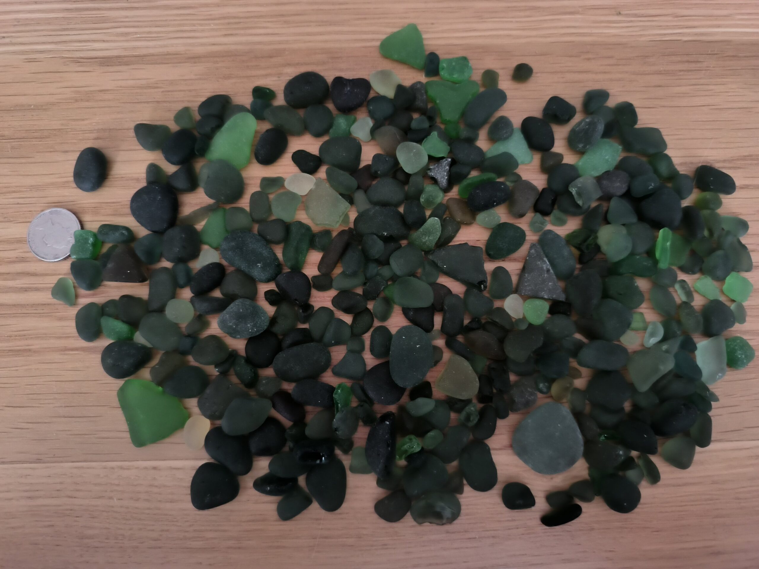 Green sea glass that has been sourced ourselves.