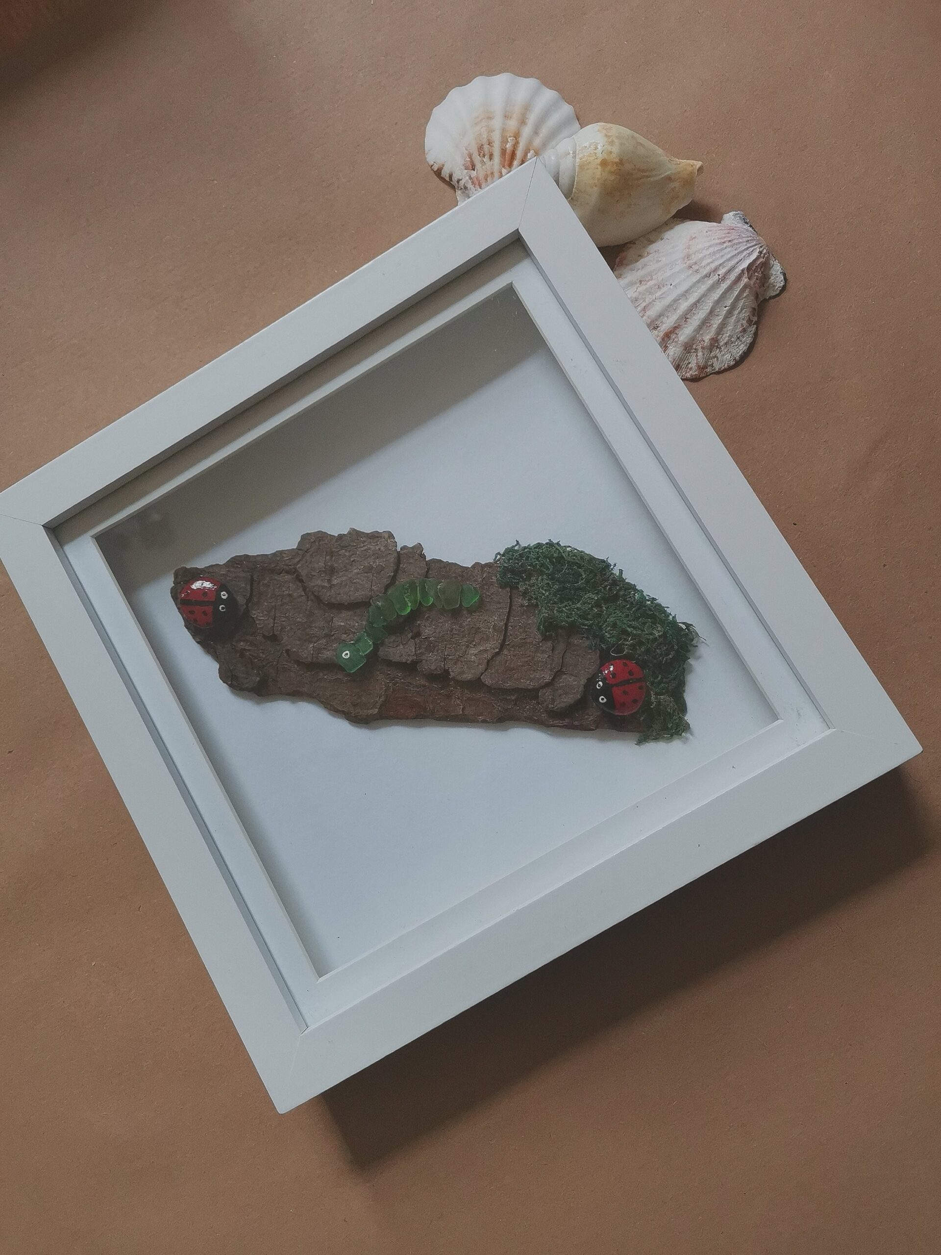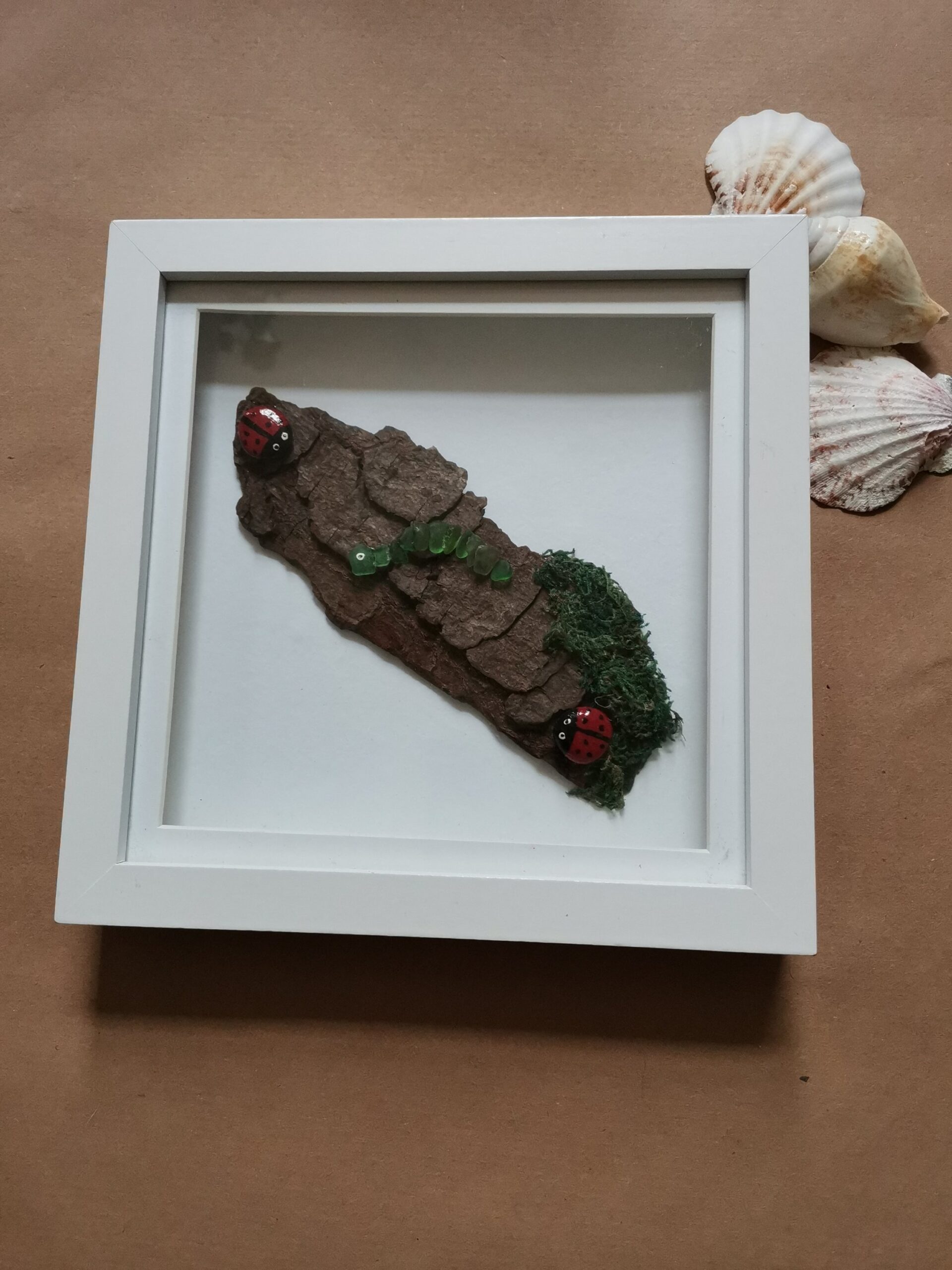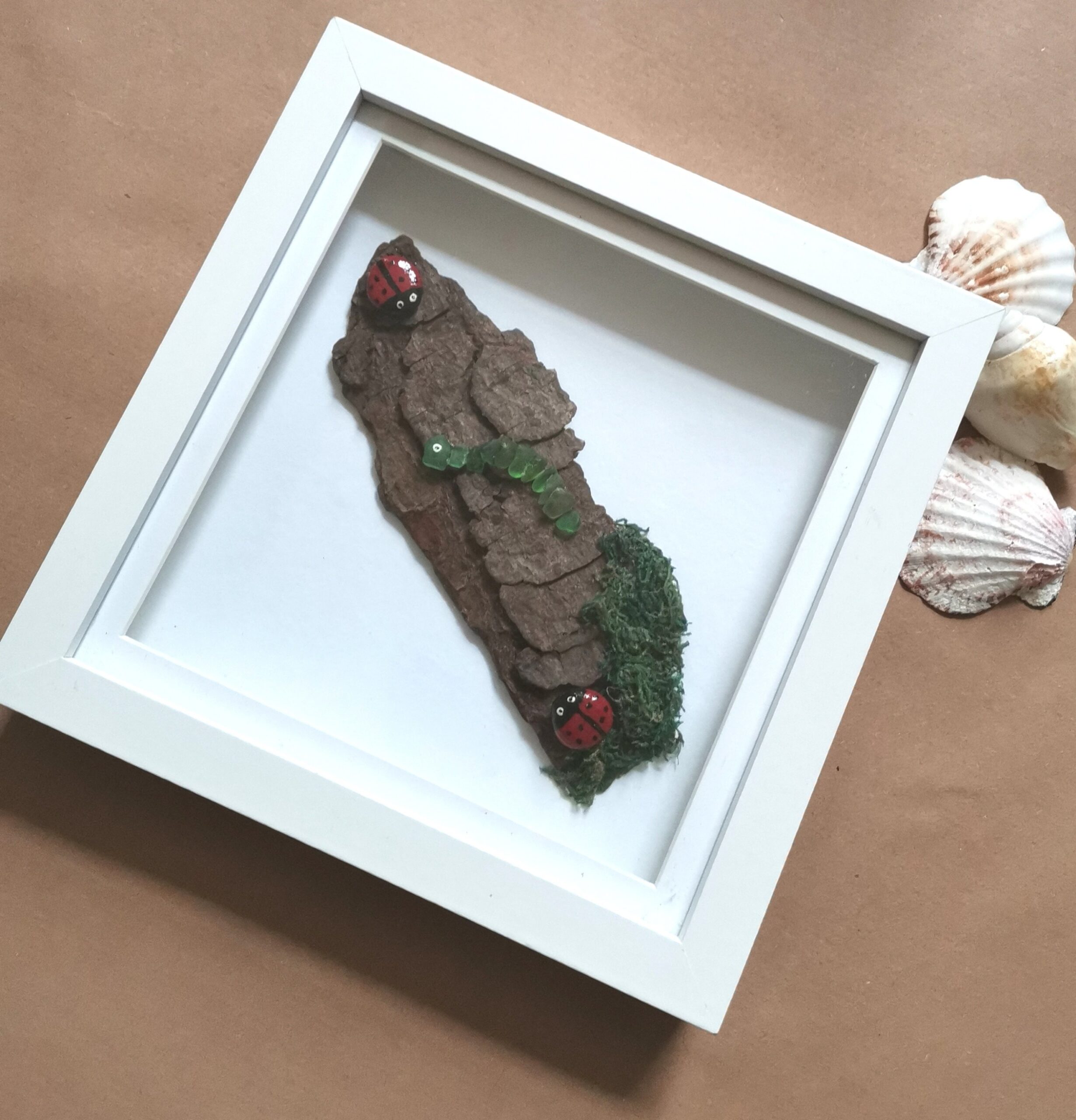 A real dried tree bark with 2 pebble ladybirds also a sea glass caterpillar with artificial moss