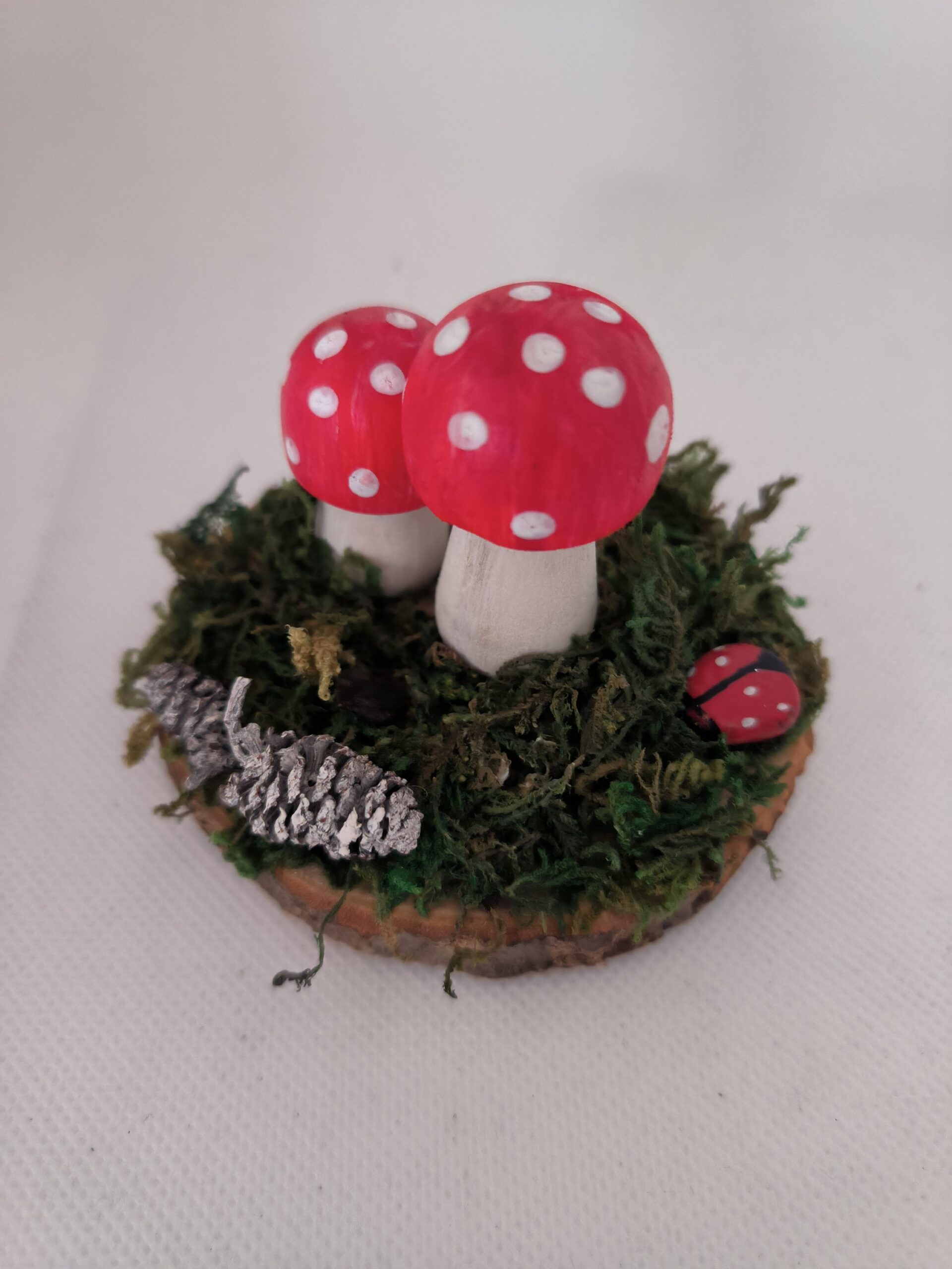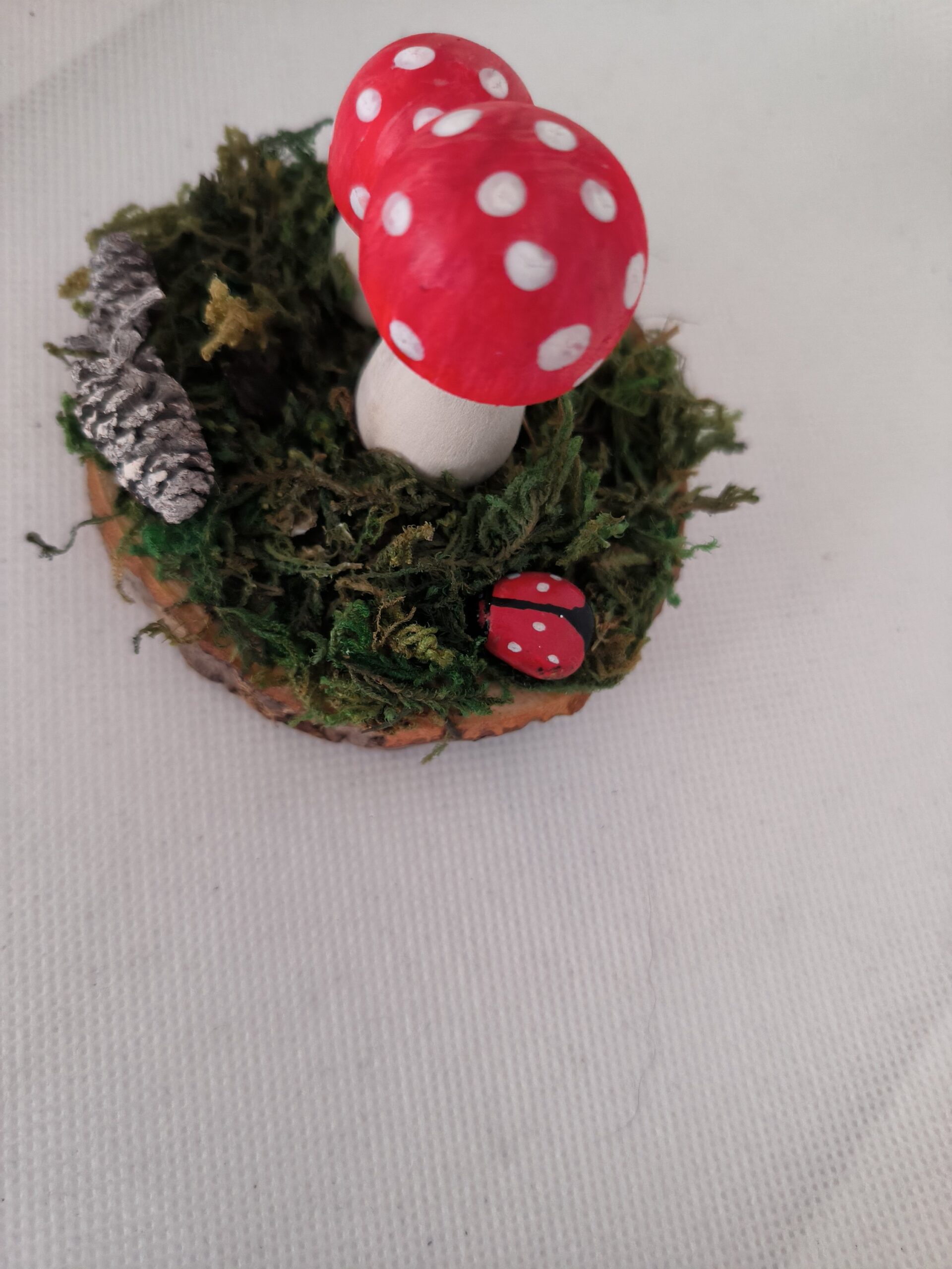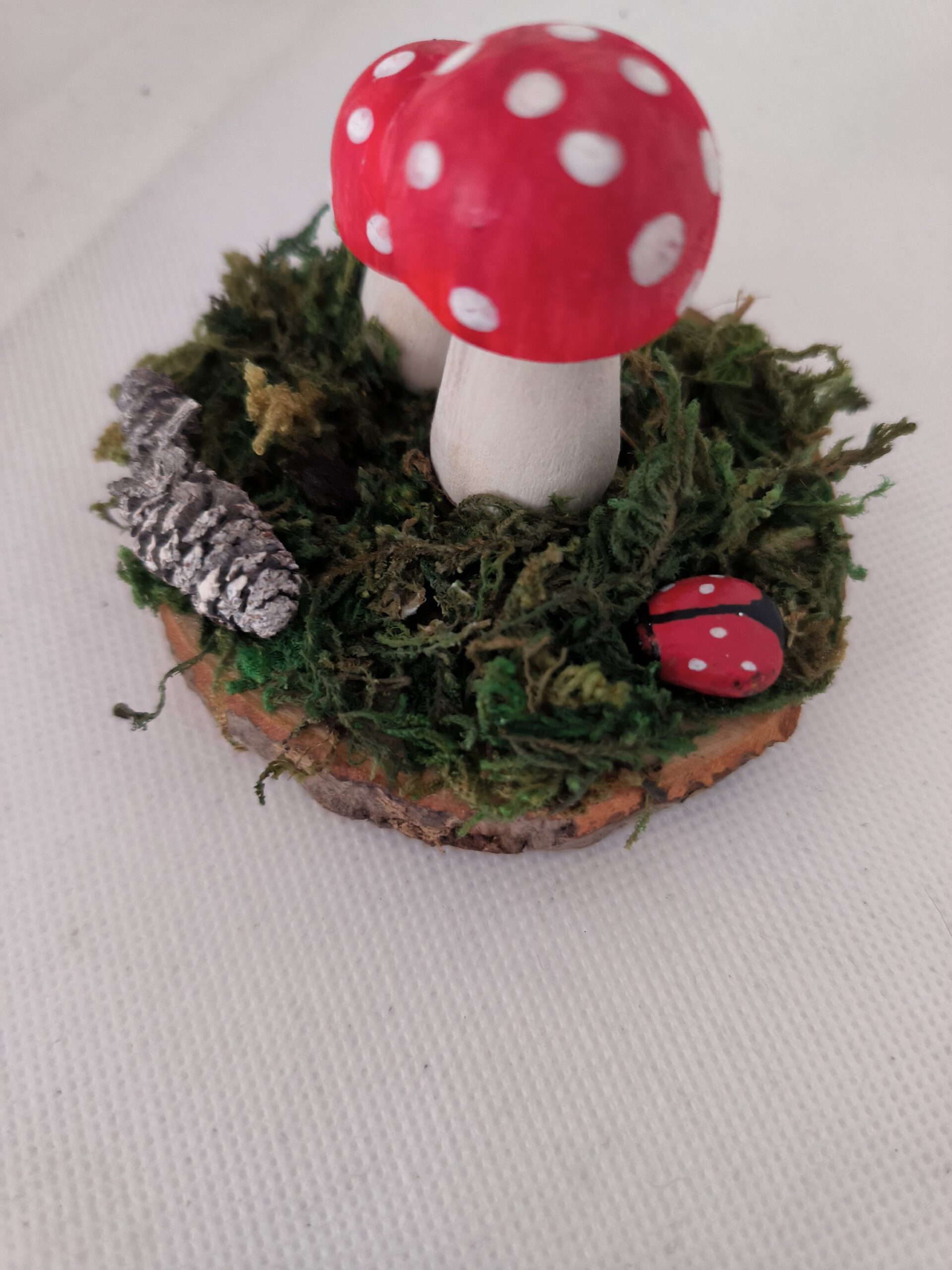 Set on a 7/8 cm logslice this is a delightful piece with painted toadstools, artificial moss, cones and pebble ladybird