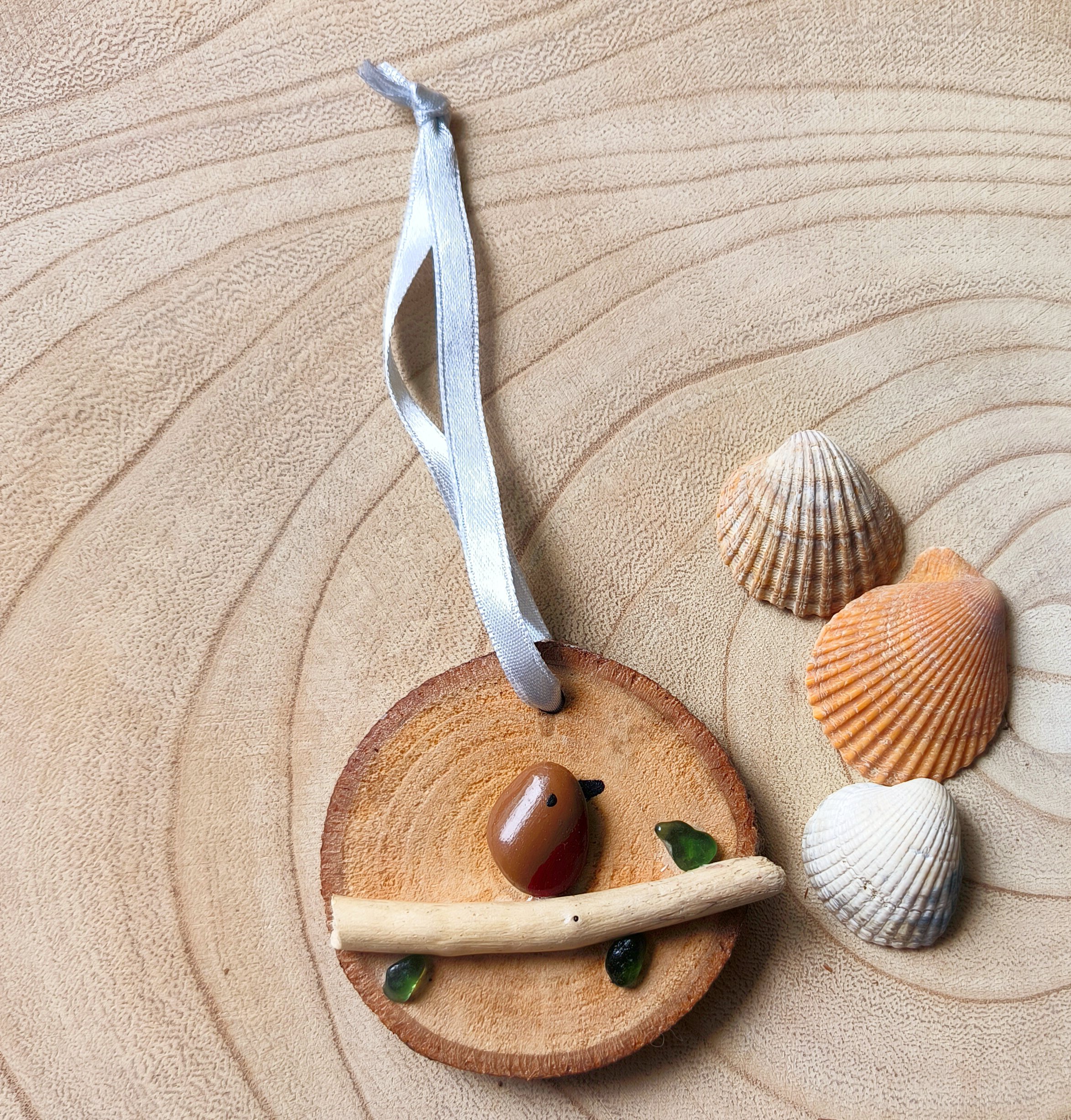 A beautiful pebble robin painted on a driftwood branch