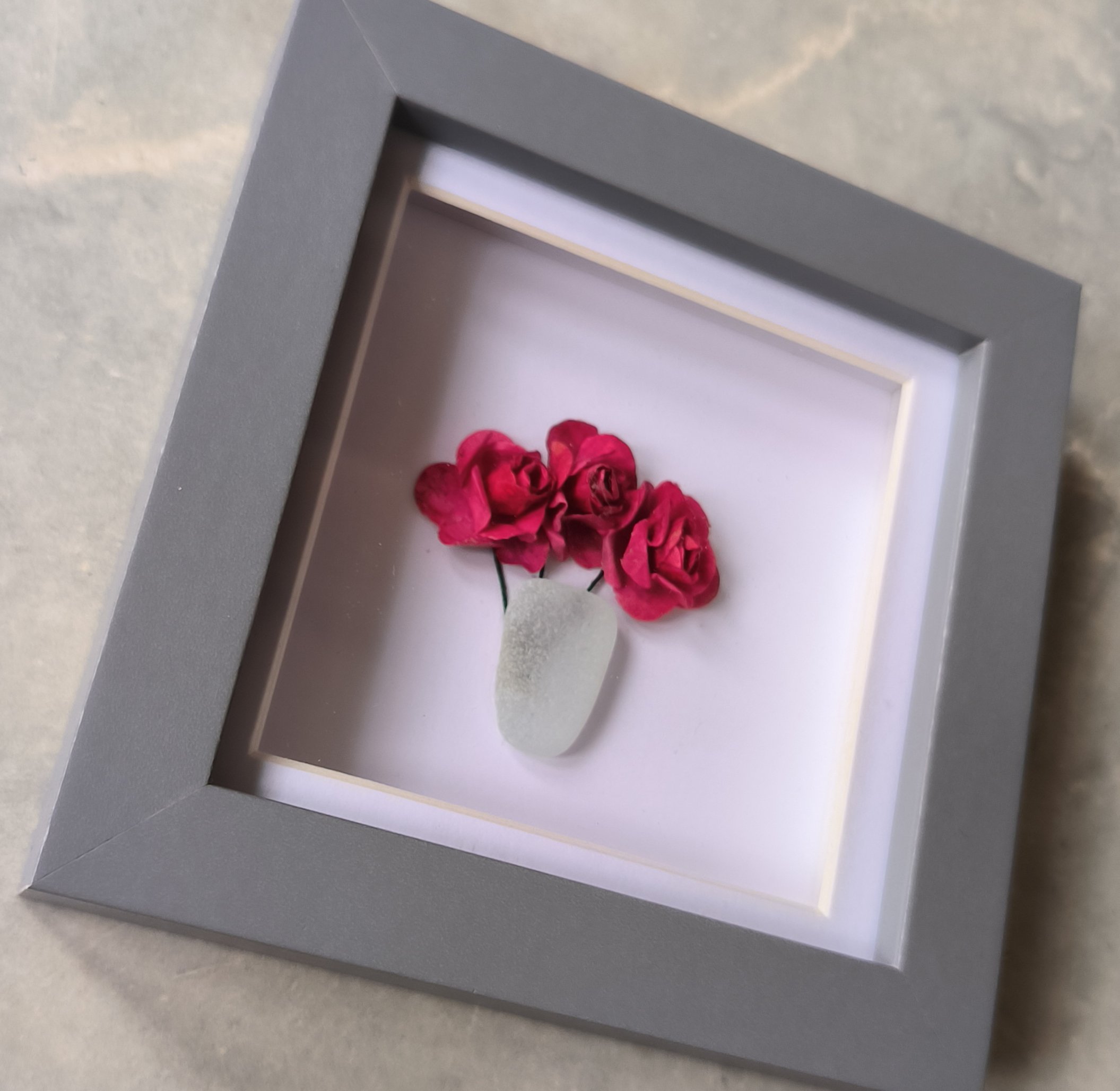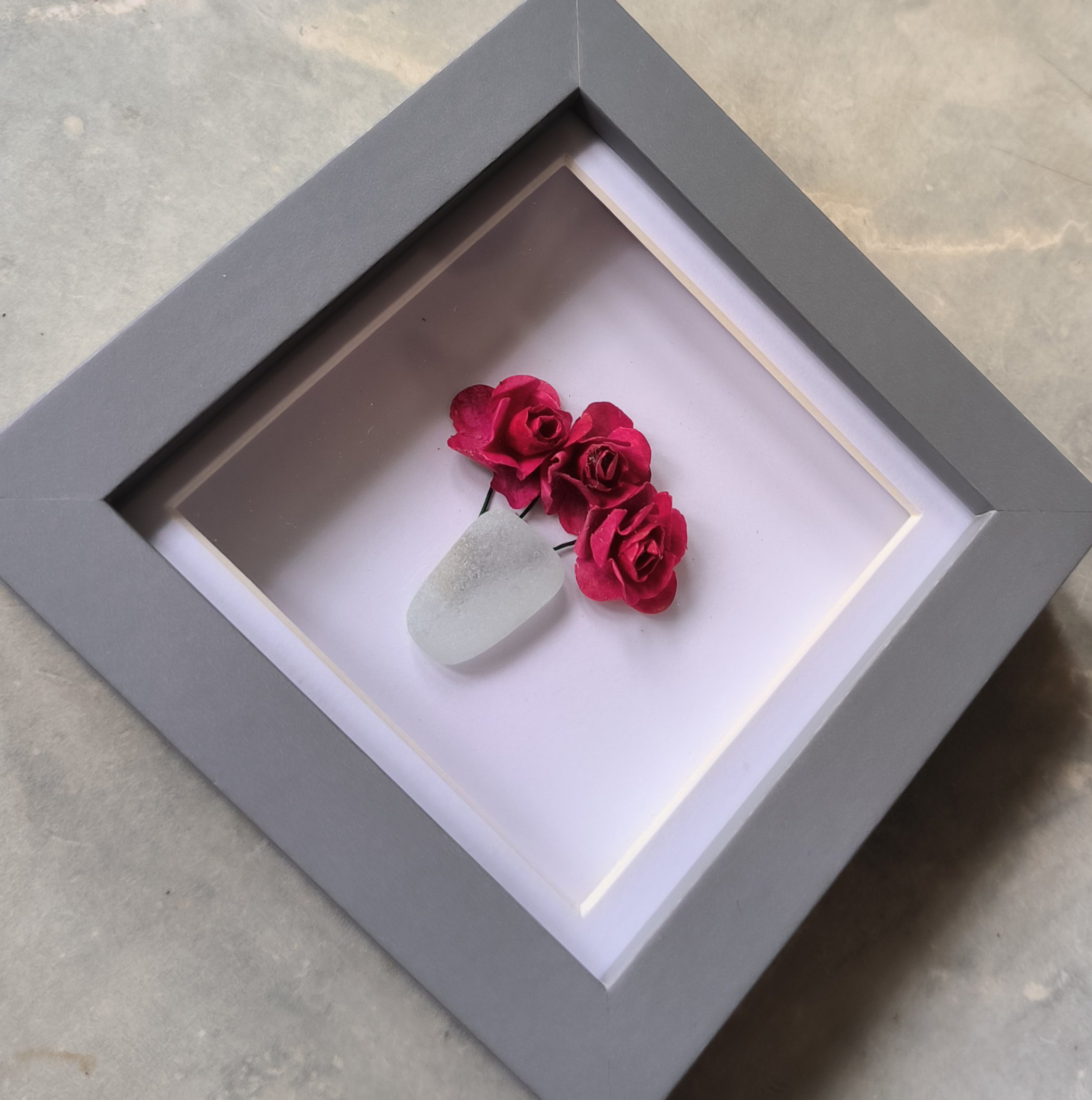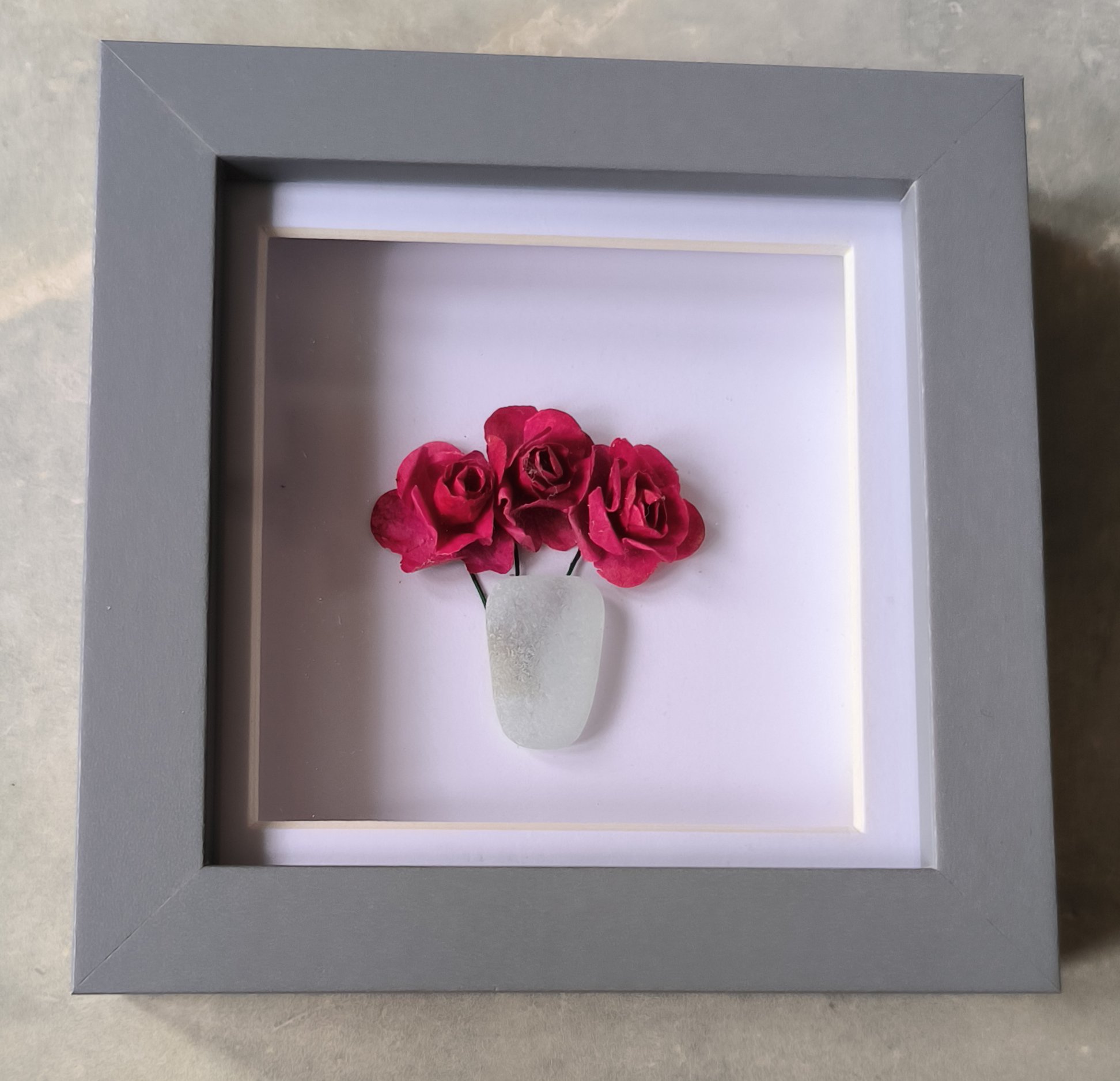 Beautiful sea glass vase with delicate paper roses .