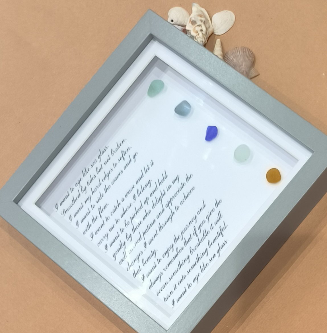 A beautiful frame with the sea glass poem and various pieces of sea glass using a rare piece of sea glass