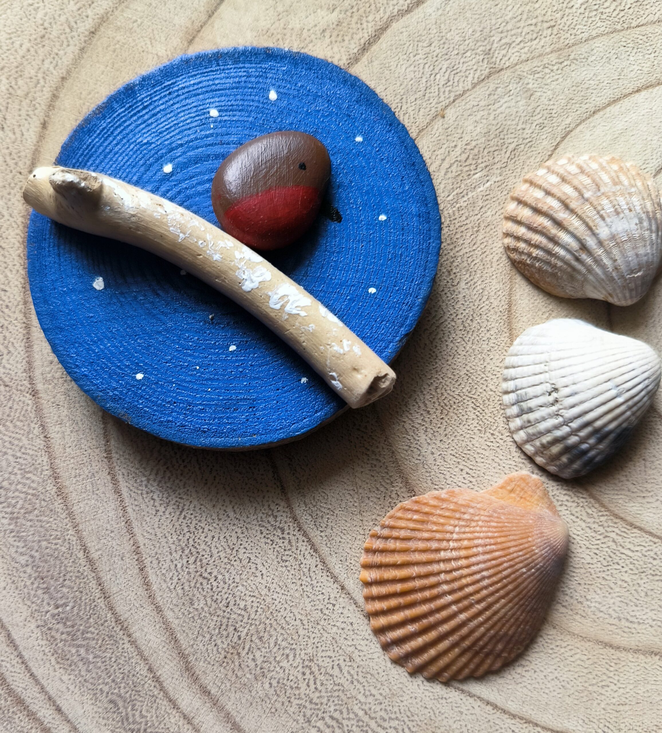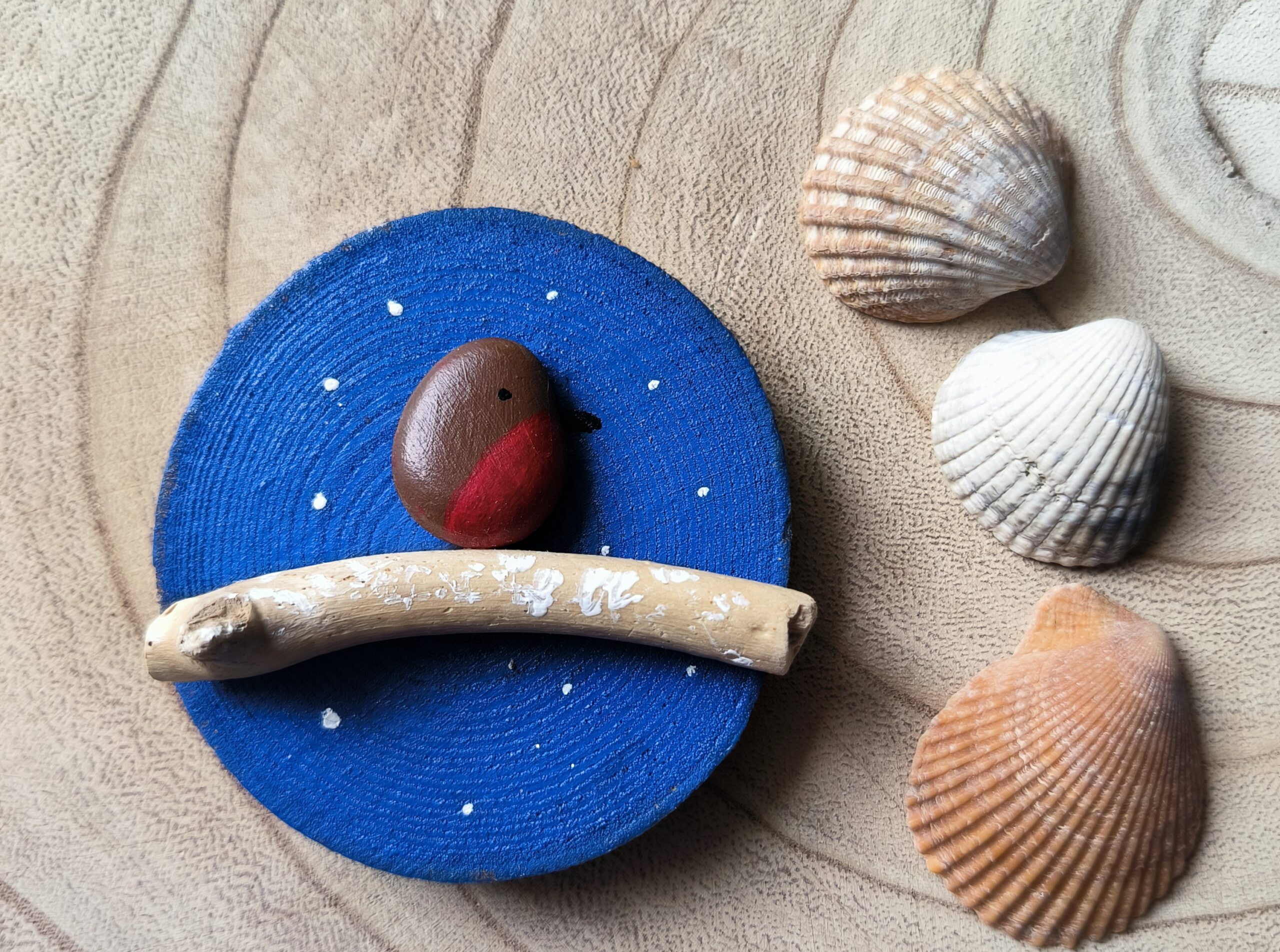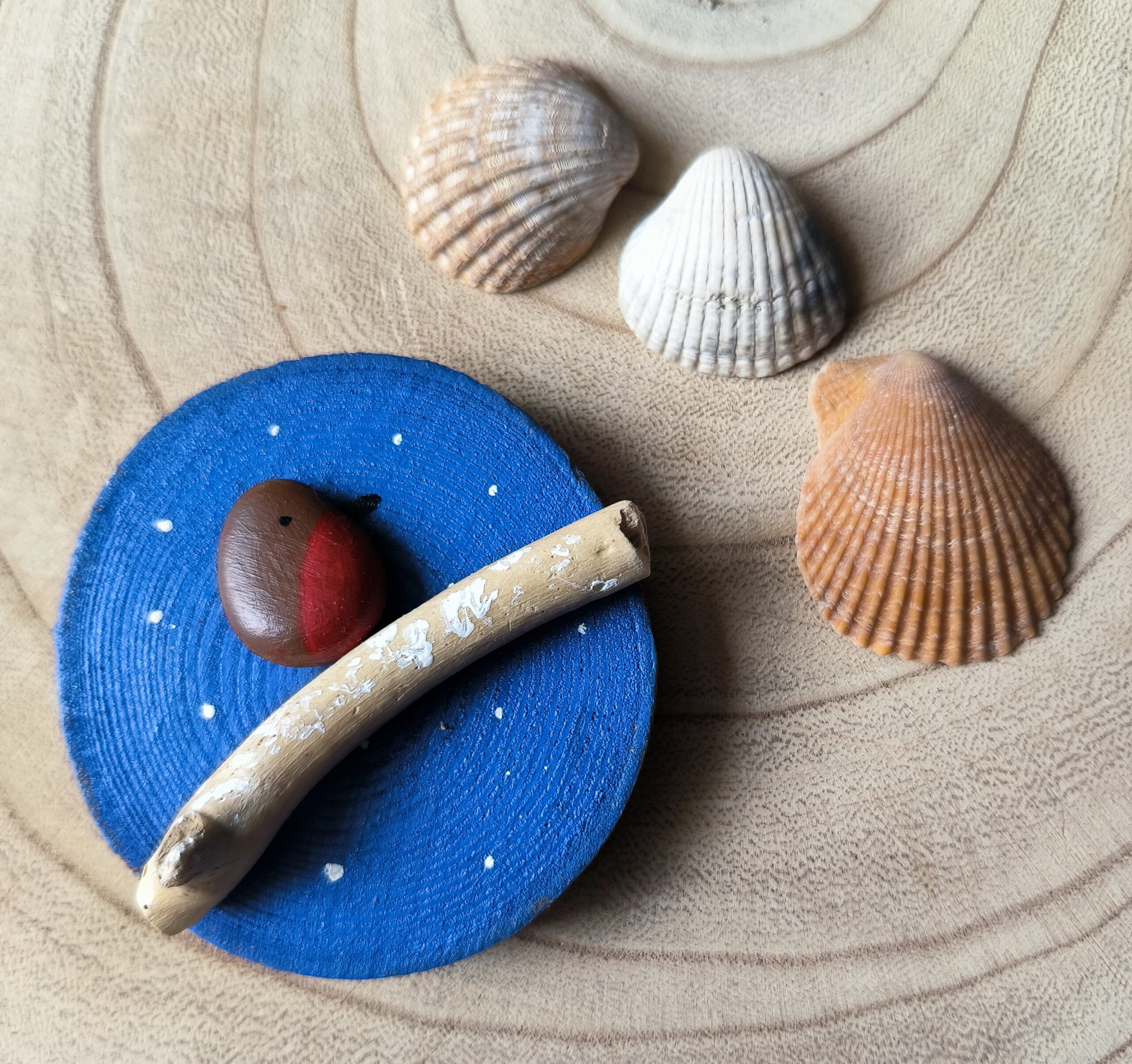 A beautiful snowy robin magnet with painted background in a lovely blue background.